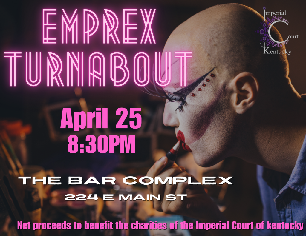 Its time to shake thins up and turn things around with the Emprex Turnabout! So come in from those April showers and join the Imperial Court of Kentucky at the Bar Complex on Saturday April 25th at 8:30pm. You can enjoy great drinks while watching a fabulous drag show! There is no cover before 9PM.